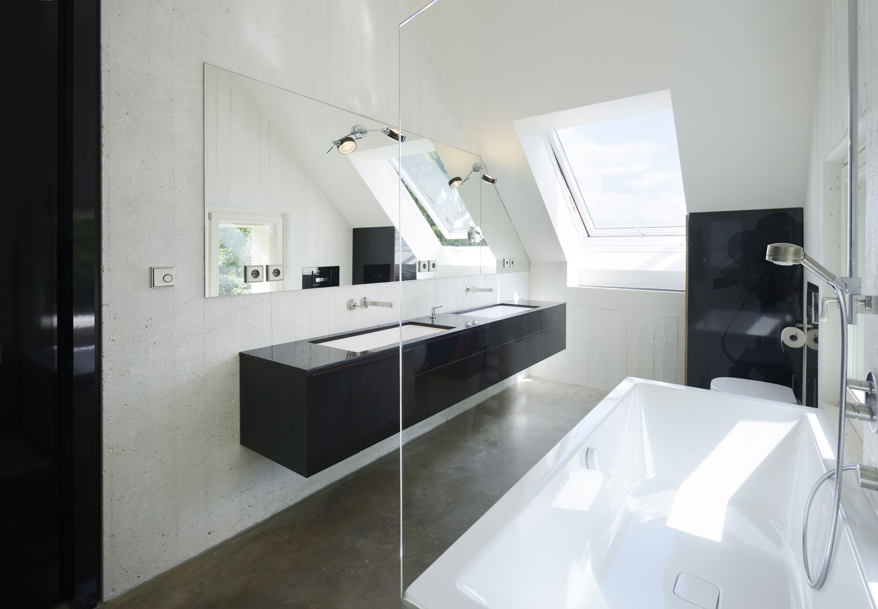 Téma masívneho stavania pokračuje taktiež v rámci historickej časti domu, a to formou monolitického vstavania stien, stropov a schodiska. Na to nadväzujú podlahy – s úpravou strojovo hladenej betónovej dosky. Vstupná hala vedie priamo do priestoru medzipodesty. Horné dve podlažia obsahujú izby a dve kúpeľne. Prízemie s jedálňou a kuchyňou smeruje do átria so záhradou. Všetky miestnosti sú prístupné z dlhej chodby, ktorá vedie pozdĺž západnej obvodovej steny.