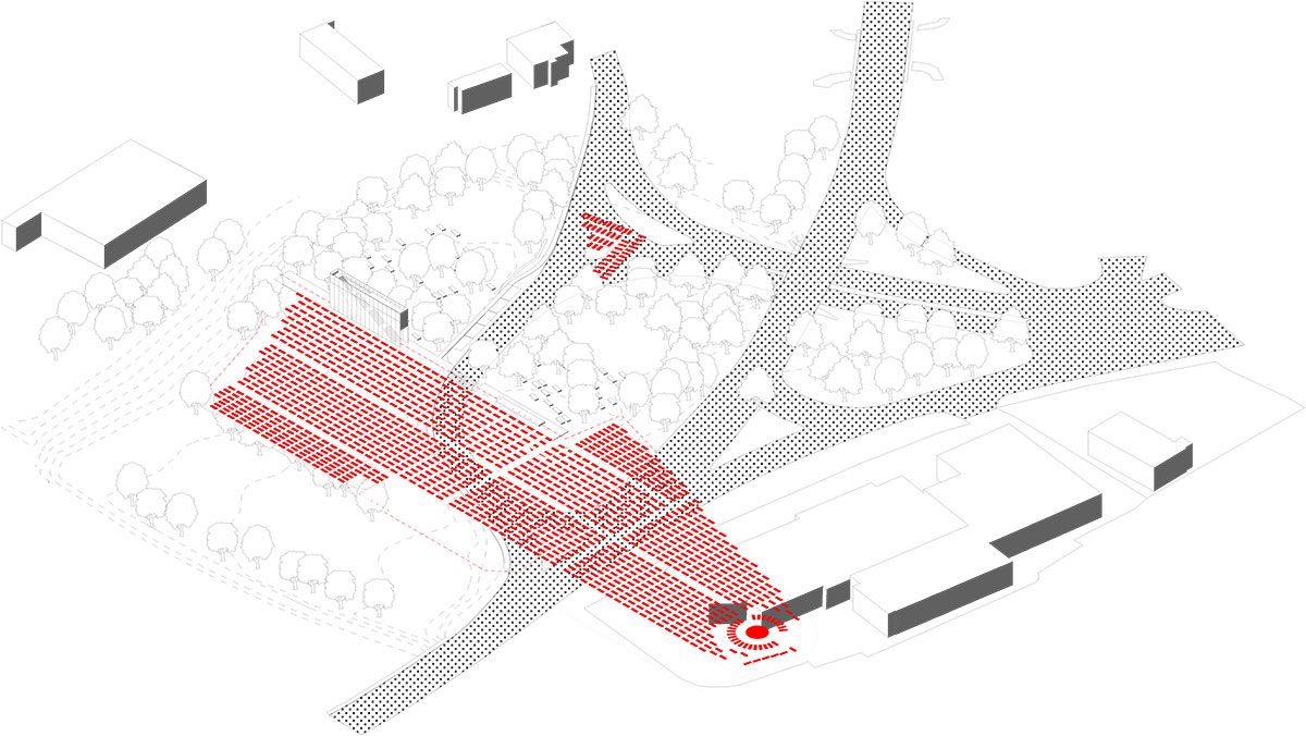 Axonometria areálu. Červeným pôvodná podoba cintorína.
