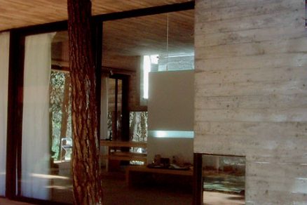 Materiál, proporcie aj jednoduchá geometria domu ladia s okolitým lesom. K symbióze stavby s okolím prispievajú i veľké sklenené plochy, v ktorých sa pri pohľade zvonka odrážajú stromy a pri pohľade zvnútra tvoria takmer nerozoznateľnú hranicu medzi domom a lesom. Bak arquitectos už projektovali viacero domov s podobným tvaroslovím. Vyznačujú sa rovnako čistými líniami, rovnými a zalomenými v pravom uhle, a striedmym materiálovým akordom atraktívne sfarbeného dreva, svetlého kameňa a bielej omietky. Celok niekedy dopĺňa vodná plocha, v ktorej sa odráža belasá obloha, alebo, rovnako ako tu, mu vládne decentná súhra betónu, dreva a načierno sfarbeného, neobyčajne odolného anodizovaného hliníka. Ich stavby sú pozoruhodné prispôsobením sa okoliu, ba až zrastením s ním. Pre dom v Bosque de Mar Azul to platí doslova – osem stromov prerastá drevenou terasou a dva dokonca stropom (respektíve terasu a strop postavili okolo stromov).