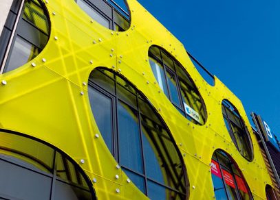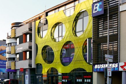 „Problémy však nastali so samotnou realizáciou fasády, pretože výrobca satinovaného PMMA odmietol garantovať bezpečnosť bodového kotvenia nami navrhnutej vonkajšej – predsadenej – perforovanej fasády.