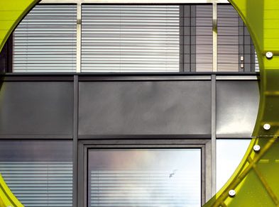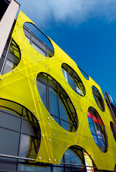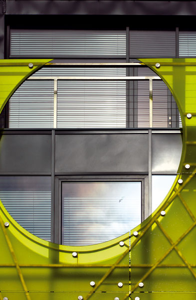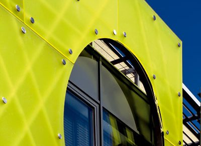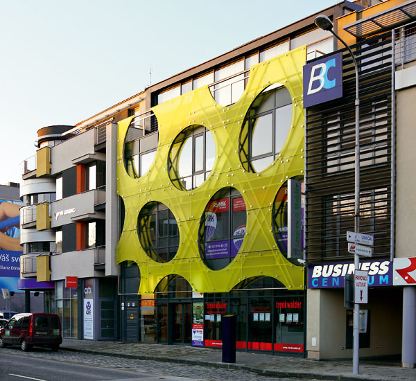 „Pri návrhu vonkajšej fasády sme zvažovali viacero alternatív priesvitných materiálov – od siete, plátna cez ťahokov až po sklo. Nakoniec sme sa rozhodli vyskúšať doteraz v exteriéri nie veľmi aplikovaný satinovaný plexiglas, pretože vynikal viacerými technickými vlastnosťami – pružnosťou a prijateľnou hmotnosťou. Devízou, ktorá presvedčila, bola vysoká citlivosť materiálu na svetlo a s ňou spojená premenlivosť podľa intenzity slnečného žiarenia – v tieni nadobúda charakter pevného, jednoliateho celku, na slnku sa mení na priesvitnú sieť, ktorá priznáva všetky vrstvy pod sebou. Táto vlastnosť bola pre projekt ideálnym riešením,“ vysvetľuje Viktor Šabík, jeden z autorov projektu.