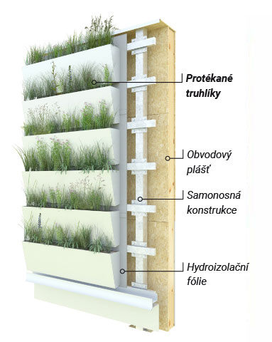 Zelené stavanie nie je len o strechách. Veľký boj s miestom v mestách nás núti premýšľať ďalej. Vyvíjame tak aj vlastné riešenie zelených fasád, teda vertikálnych záhrad, ktoré je možné aplikovať ako kotvené do fasády alebo samonosné pred-sadené konštrukcie.