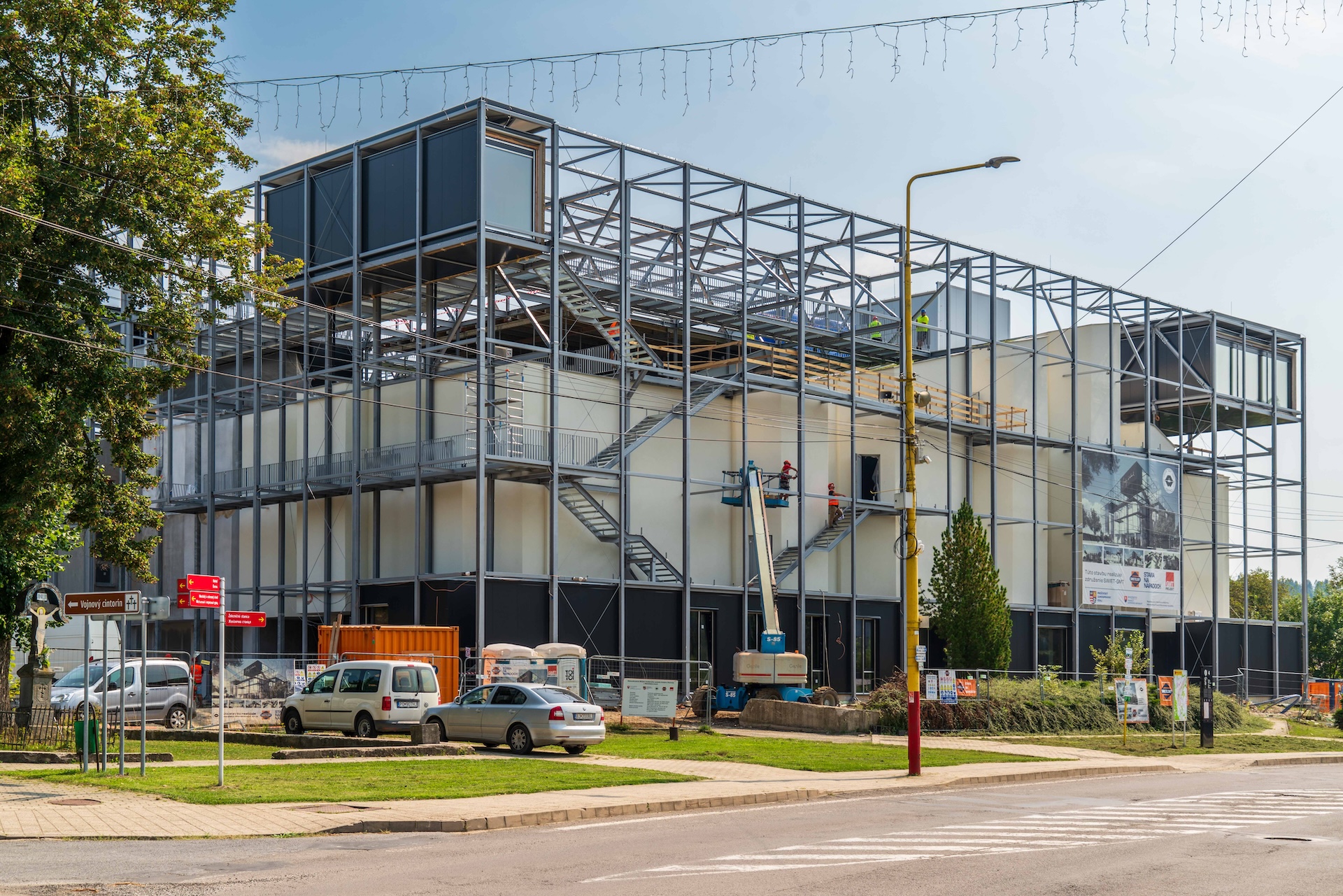 Po rozsiahlych búracích, zemných a zakladacích prácach realizovaných v roku 2023 a opísaných aj v článku našej redakcie sa v tomto roku začalo intenzívne pracovať na zatepľovaní fasády a strechy, výmene rozvodov, montáži okien a mohutnej oceľovej konštrukcie s osadením výstavných „blackboxov“.