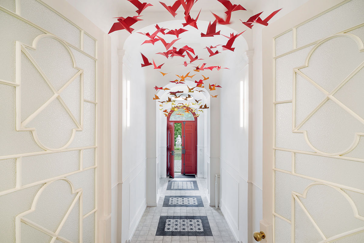 V škôlke napríklad museli dbať, aby si malé deti nepripadali stratené v priestore s vysokými stropmi. Minimalistické vybavenie a jemné farebné ladenie dávajú vyniknúť hravým doplnkom a detailom. Origami vtáčiky a oblaky z tvrdého papiera opticky znižujú vysoký strop a vnášajú do priestoru nečakaný moment.