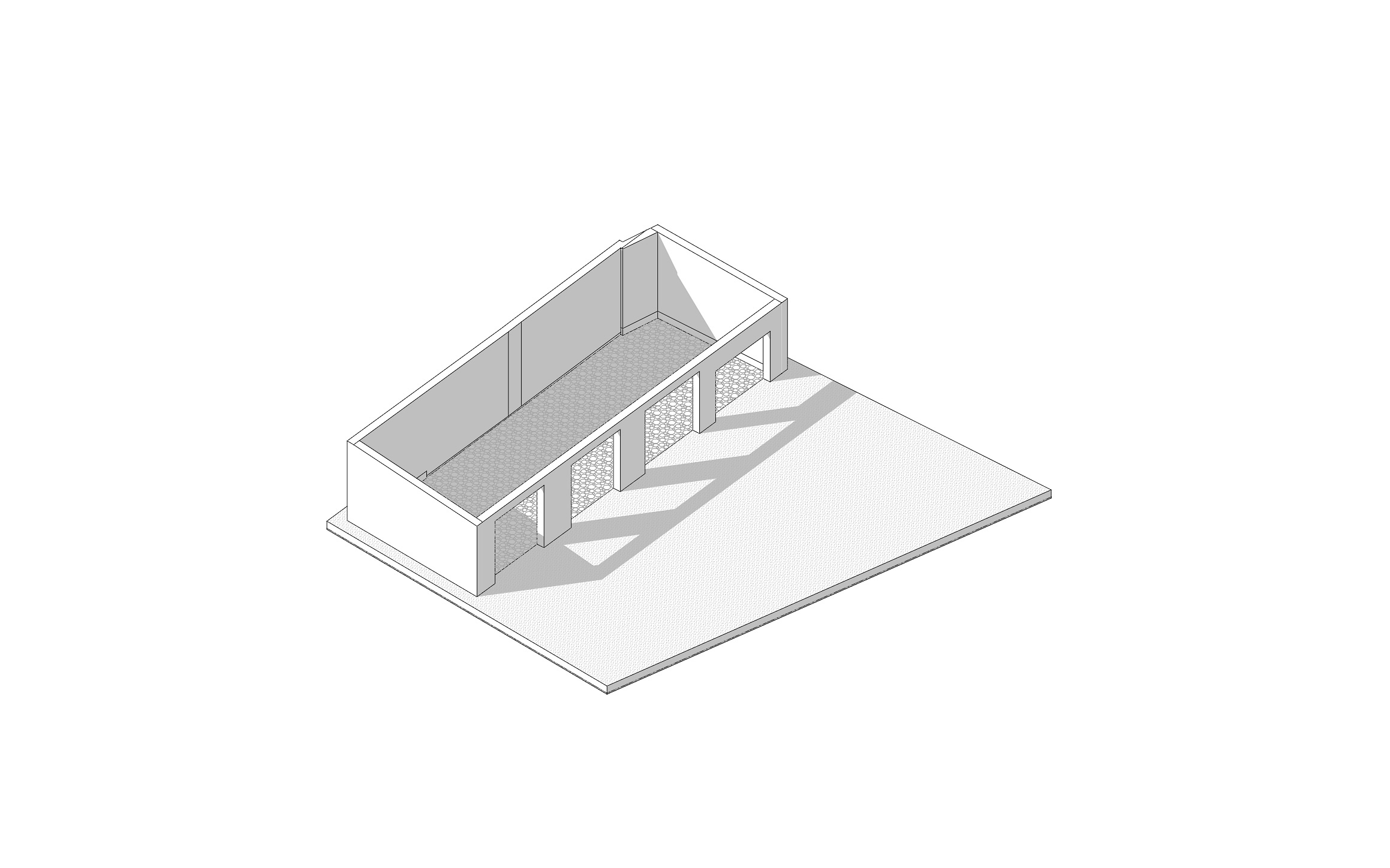 Axonometria garáže – stav po odstránení strechy, vnútorných stien a podlahy