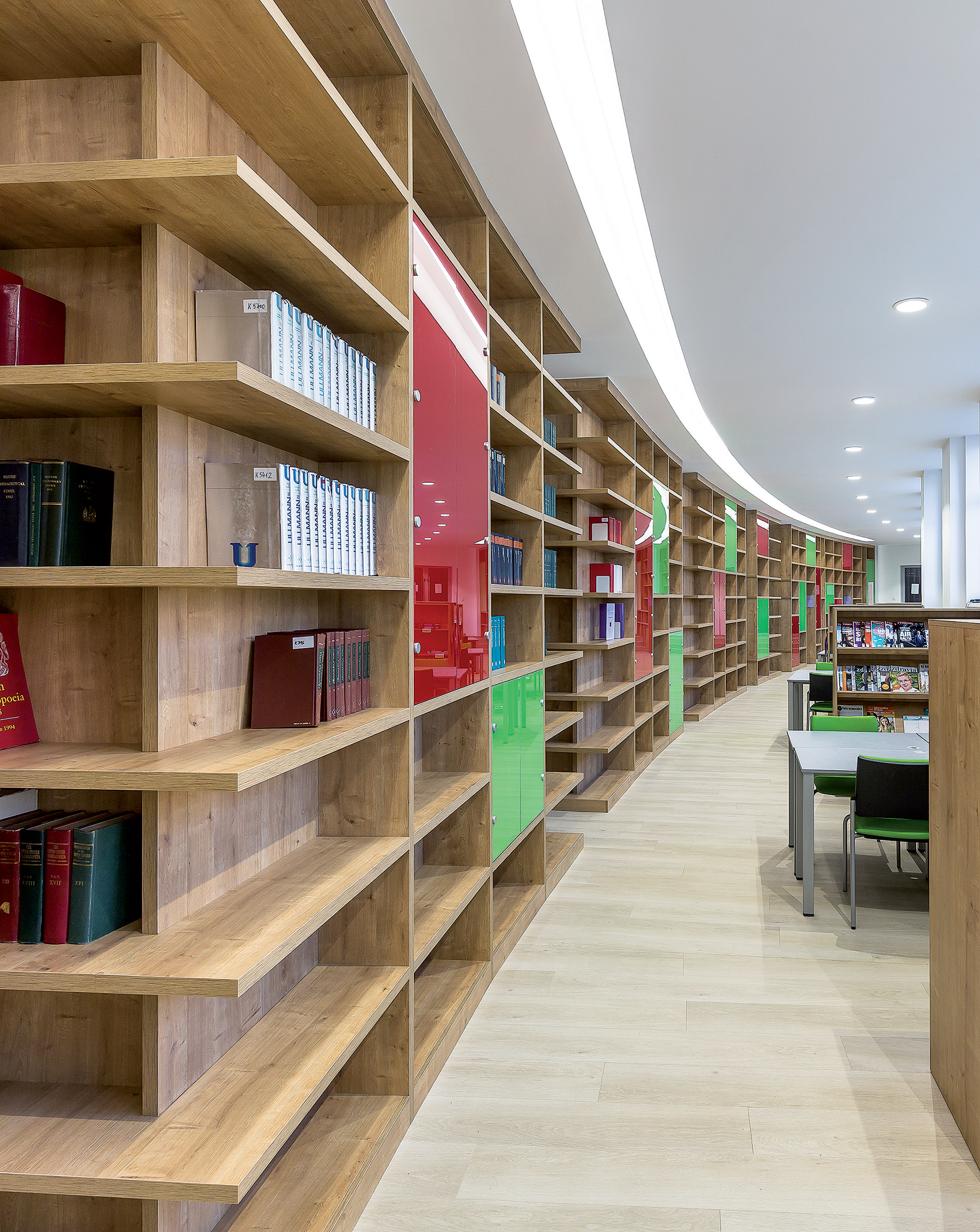 „Bola to iná téma a aj iná architektúra,“ hovorí architekt Július Toma. „Ide o netradičnú oblúkovú budovu bývalého II. reálneho gymnázia z rokov 1940 – 42, postavenú podľa projektu architektov Floriansa a Schreibera. Pôvodne slúžila ako cirkevná škola s kláštorom. Školská dispozícia je v regionálnej moderne s klasicizujúcim výrazom a vertikálnym členením. Požiadavka na voľný výber kníh v novej knižnici si vyžiadala aj novú dispozíciu. Okrem vejárovitého usporiadania kníh v jadre dispozície sme zapracovali do pôdorysu aj študijné miesta a variabilný voľný priestor na prednášky, prezentácie, verejné čítanie, diskusie a konferencie. Materiálovo a tvarovo sme nadviazali na naše práce v predchádzajúcich etapách v objekte FaF UK.“