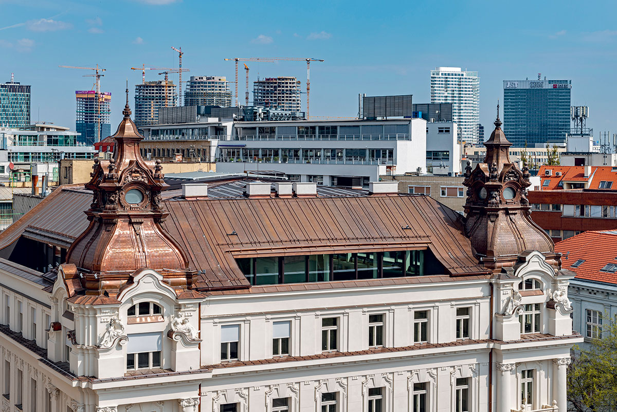 Pohľad na zrekonštruovanú nadstavbu v kontexte panorámy mesta.