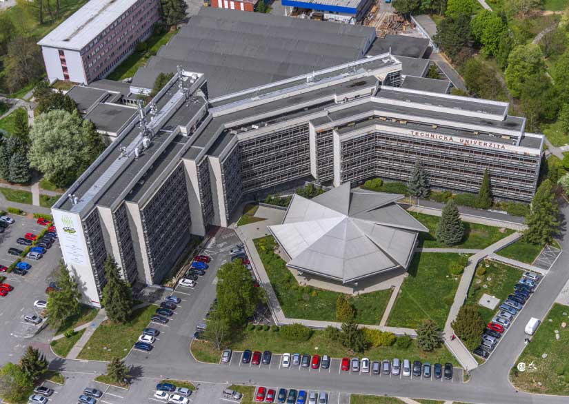 Centrum areálu Vysokej školy lesníckej a drevárskej (1984) vo Zvolene tvorí aula, sčasti obklopená dvojnásobne zalomeným monoblokom katedier. Nadzemnú hmotu auly tvoria dva osemboké ihlany navzájom spojené základňami, pričom jednotlivé trojuholníkové časti strešného ihlana sú voči sebe vertikálne pootočené.Zdroj: Technická univerzita vo Zvolene