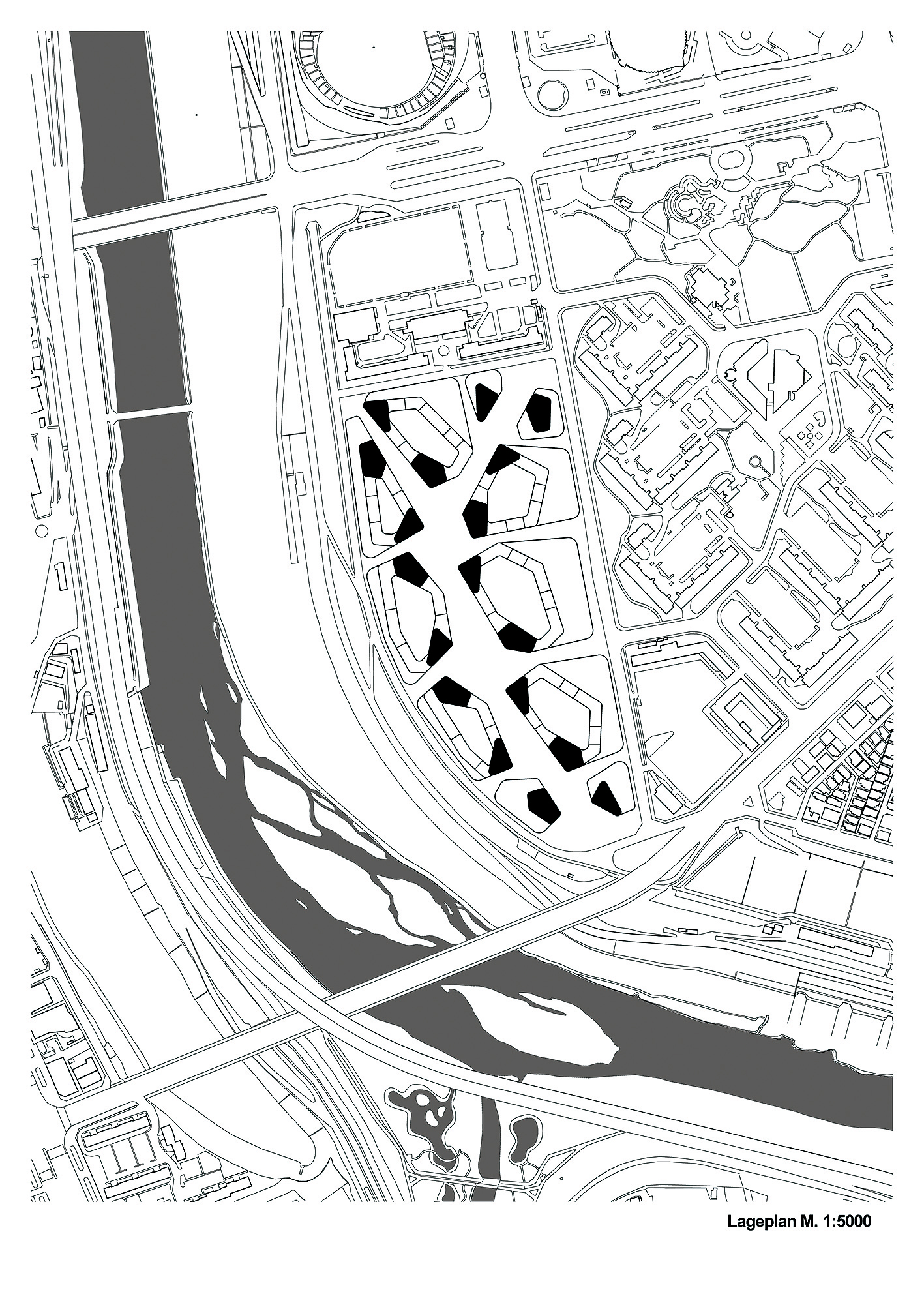 „Parteru sme pri budovách venovali veľkú pozornosť a snažili sme sa mu vtlačiť vitálnu atmosféru,“ uvádza rakúska kancelária AllesWirdGut v urbanistickej koncepcii. „Vytvorili sme verejné, poloverejné i súkromné vonkajšie priestory, ktoré sú hnacím dynamom života celého urbanizmu. Diferencované priestorové sekvencie sú rozvíjané v nadväznosti na rôzne vonkajšie plochy – ulice, chodníky, námestia, ihriská a záhrady – sú nenásilne, ale precízne hierarchizované podľa stupňa charakteru danej funkcie alebo prírodných miest v prostredí lužných lesov pri rieke.“