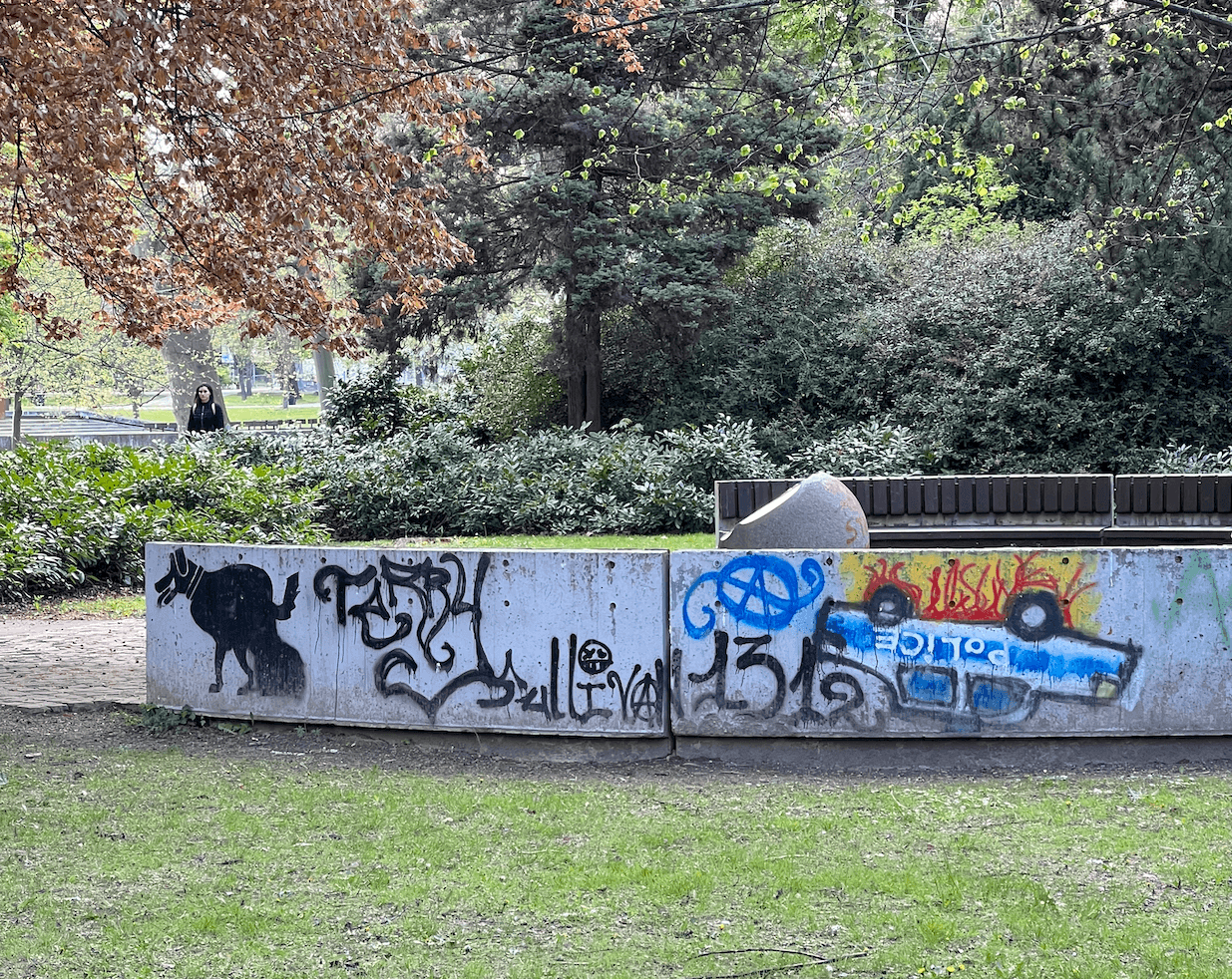 Grafiti na nedávno obnovených polkruhoch v Sade Janka Kráľa.