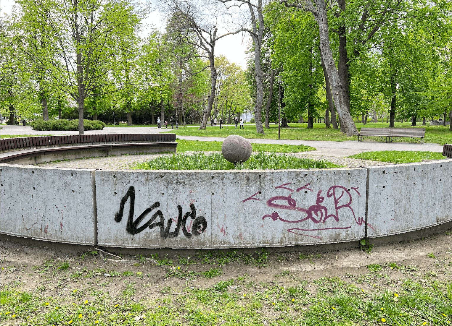 Grafiti na nedávno obnovených polkruhoch v Sade Janka Kráľa.