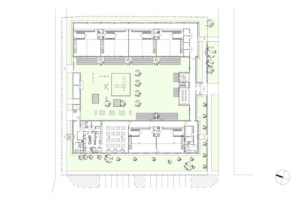 Herne detí sú na prízemí a spálne na poschodí v podkrovnom priestore s galériou, ktorá tieto priestory prepája. Vo vstupnej časti sa nachádzajú priestory vedenia škôlky so zborovňou – umožňujú kontrolovať vonkajšie aktivity na dvore a terasách a zároveň kontrolovať pohyb v rámci objektu.