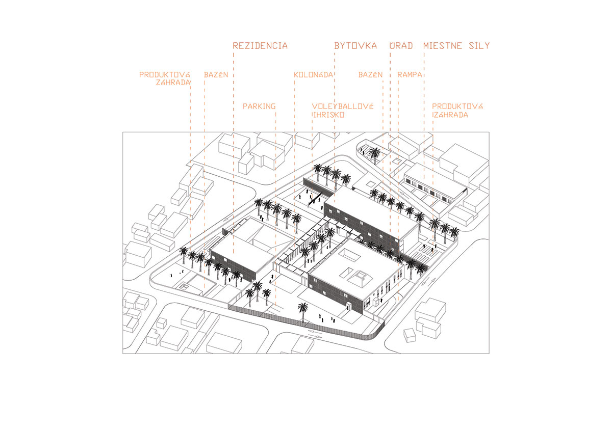 Axonometria komplexu ambasády.