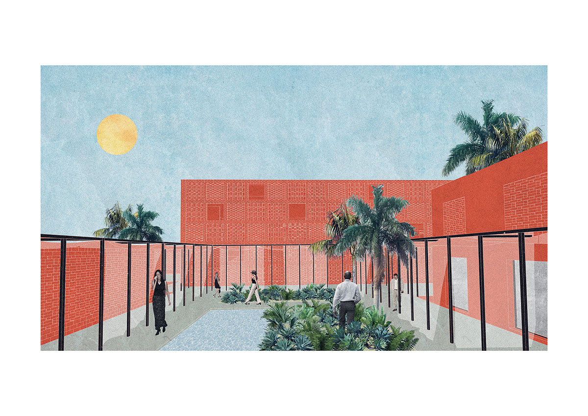 Oceľová kolonáda vytvára spoločný verejný priestor.