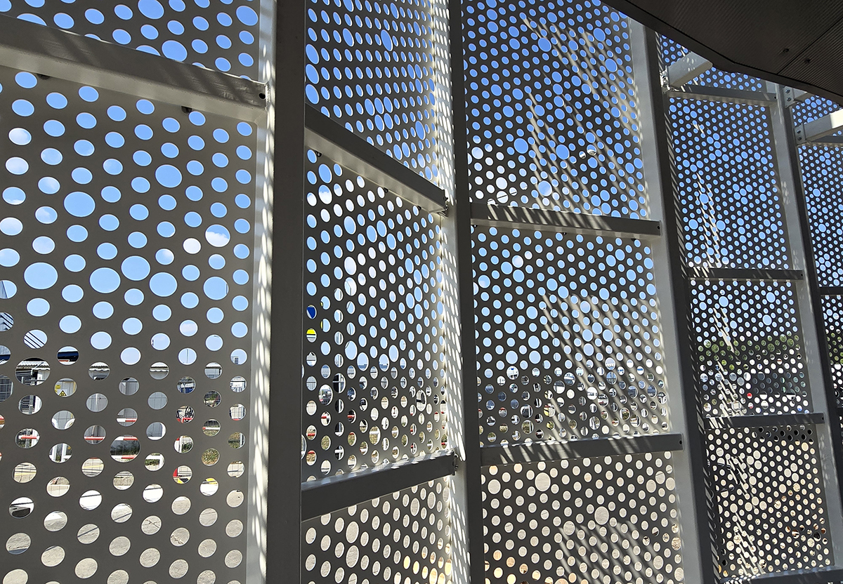 Perforovaná oceľová fasáda halového objektu s reguláciou svetla