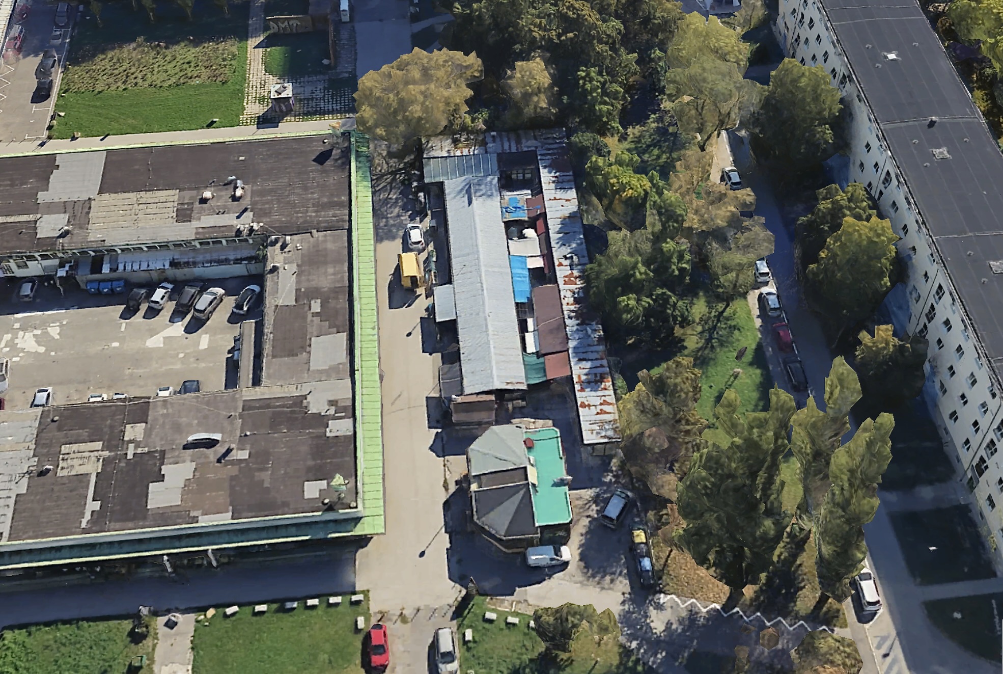 Trhovisko na Herlianskej (v strede). Vľavo sa nachádza Obchodné centrum Helios