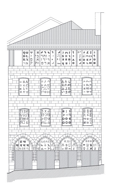 Architekti nazývajú fasádu, a v podstate aj samotnú stavbu, mašrabijským typografickým polygotom. Mašrabíja predstavuje arabský štýl priečelia domu, charakterizovaný oknami s vyrezávanou mriežkou (obvykle od druhého podlažia nahor), ktorý sa vo veľkej miere využíval od obdobia stredoveku až do polovice 20. storočia.