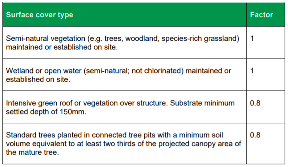 Časť tabuľky rôznych faktorov z London Plan − časť o Urban greening factor.