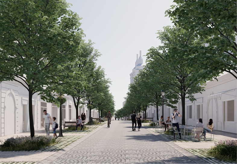 „Pozdĺž fasád je umiestnený chodník pre peších, oddelený od stredového zdieľaného priestoru pobytovým medzipruhom,“ uvádzajú architekti v štúdii. „Vjazdy do jednotlivých objektov budú zvýraznené zmenou štruktúry dlažby a kladačského plánu,“ spresňujú.