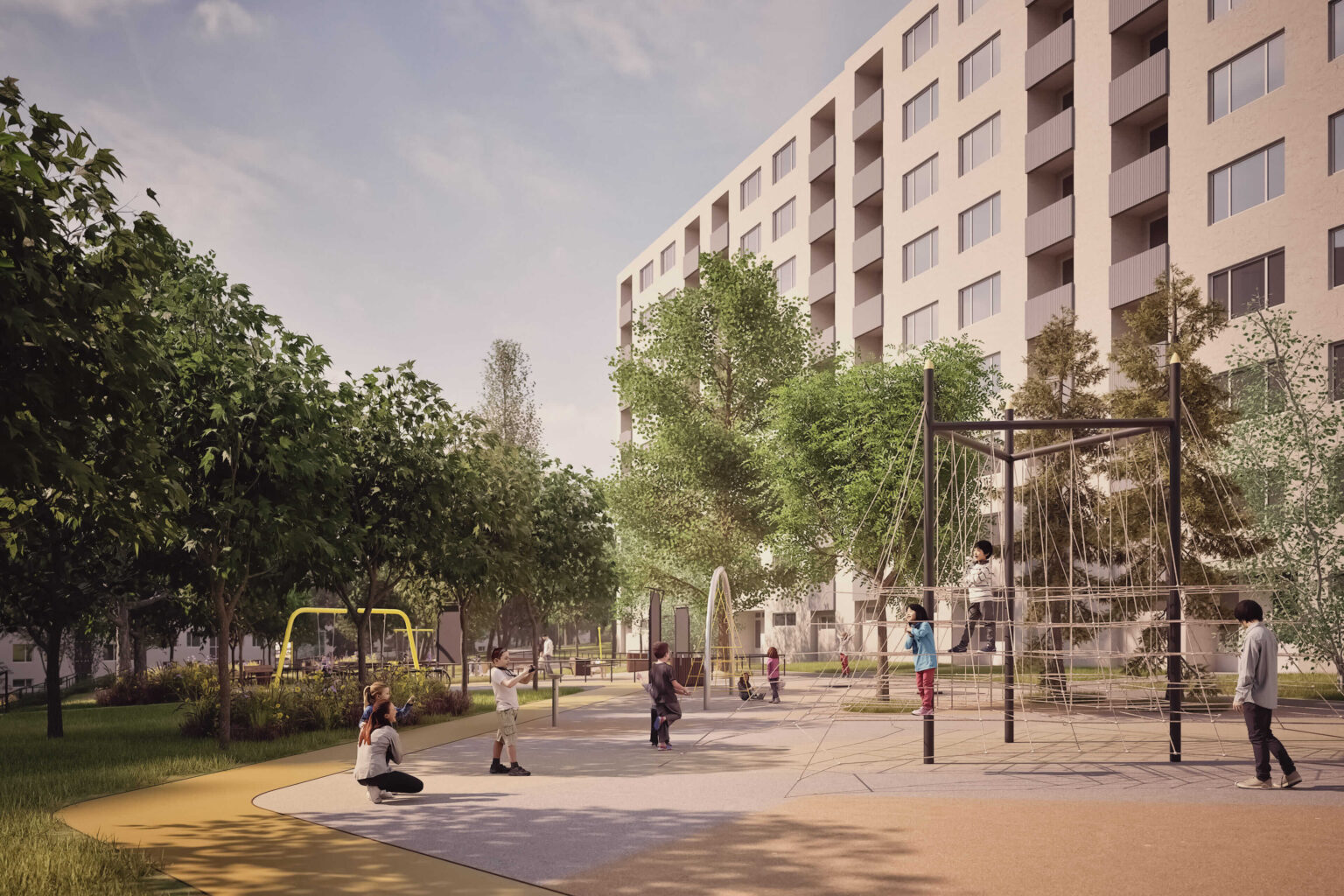 „Medzi bytovými domami, ktoré sú blízko seba, umiestňujeme kľudový oddychový park, pôvodné detské ihrisko rozširujeme a delíme na rôzne vekové kategórie, pridávame na priestranstvo možnosť vzniku sezónnych prevádzok s posedením aj moderný športový workout a revitalizujeme multifunkčné ihrisko. Chýbať nebude ani oplotené venčovisko pre psíčkarov,“ približuje architekt.
