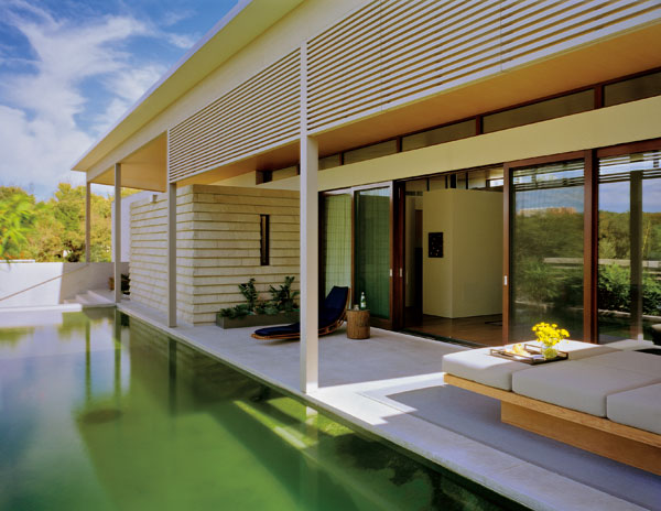 Podľa zelene v záhrade a okolí domu by asi málokto tipoval, že dom stojí na predmestí texaského hlavného mesta Austin, v rovnakej zemepisnej šírke ako napríklad Káhira. Čosi naznačujú kryté terasy a slnečné clony, tie by však boli užitočné aj v našich letách! Túto nevšednú rezidenciu navrhol Richard Gluckman, známy najmä projektmi pre svetové múzeá.