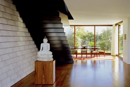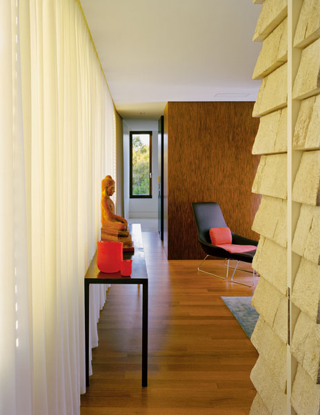 | Hoci terasa medzi nádržou s japonskými kaprami a obývacou izbou je orientovaná na ulicu, vďaka paravánovým múrikom pred domom je aj tu nerušená idyla. Zaujímavý je samostatný nízky kvádrový objekt – praktický šatník s príslušenstvom. Vchádza sa doň z chodby pred kuchyňou, ktorej neúplný múr je vidieť cez otvorené posuvné dvere na verande. | Mágia čistej plochy vo vstupnej hale. Účinok si treba trochu domyslieť – vpravo, oproti múru vyloženému štiepaným texaským vápencom, stojí stena z mliečneho skla, priestor korunuje socha. |