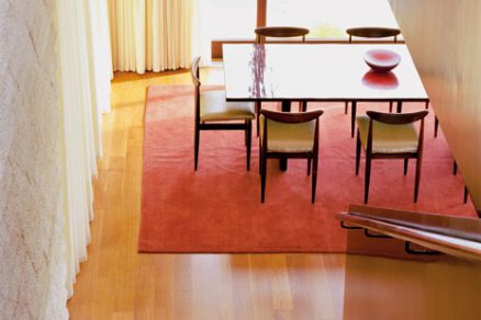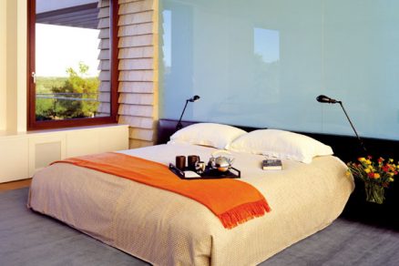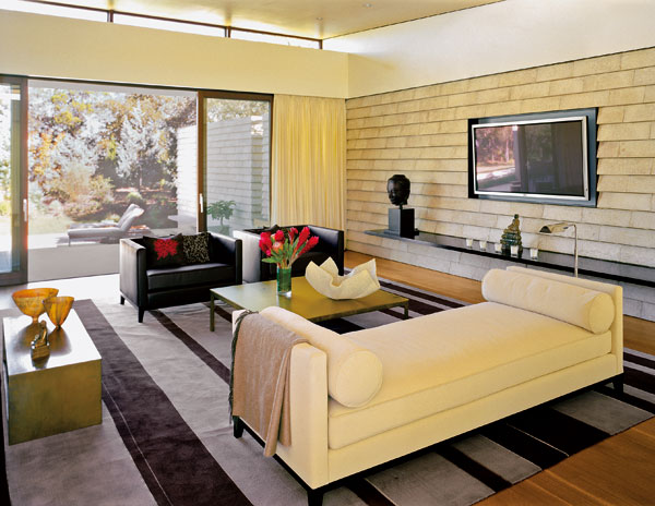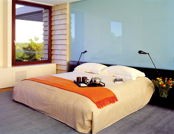 | V obývačke sa opakuje kontrast svetlého kameňa a tmavého matného kovu, z ktorého je dlhá odkladacia doska. Stojí na nej pravdepodobne najvzácnejšia socha Budhu v dome, zo 16. storočia. | Veľká spálňa s mimoriadne charakteristickým Gluckmanovým prvkom – stenou obloženou sklom so zadným farebným náterom. Kvôli farebnej kompozícii v tejto časti miestnosti dubovú podlahu takmer celú zakrýva ručne tkaný koberec. |