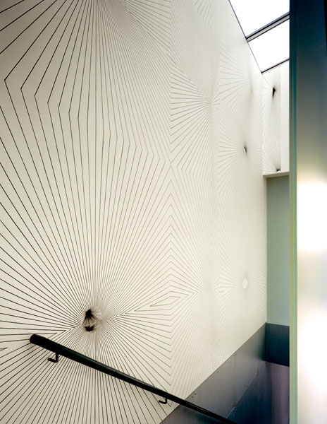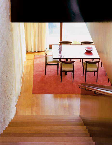 | Architekt Gluckman je známy motívom „box within a box“ (škatuľa v škatuli). Takéto vložené objekty nájdeme aj v tomto dome – jedným je šatník – kváder (ohraničuje ho časť múru s kamenným obkladom) vysunutý mimo obvodu domu, ktorý na priečelí vytvára vpravo od vstupu kompozičný „schod“, ďalším boxom je kuchyňa s múrmi, ktoré nesiahajú až po strop. Zariadenie kuchyne je čisto Gluckmanov dizajn. | Suterén domu je osvetlený cez veľký svetlík a do vstupnej haly sa kráča popri múroch schodišťa s maľbou glasgowského výtvarníka Richarda Wrighta. |