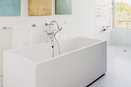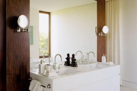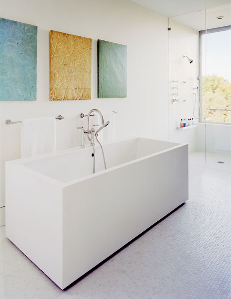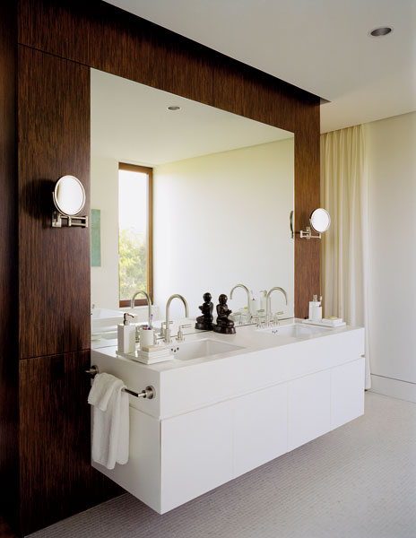 | Vo veľkej kúpeľni je použitý biely corian, sú tu armatúry od Dornbrachtu, hranatá vaňa od Boffi – všetko prvky typické pre interiéry firmy. Stenu aj umývací pult z kombinácie dreva wengé a corianu navrhli Gluckman Mayner Architects. Na stenách visia obrazy španielskeho maliara Antonia Murada, ktorý žije v New Yorku. | ||