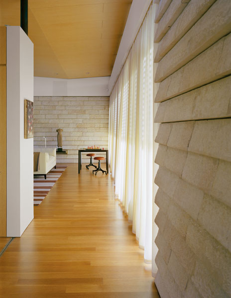 Čo teda dom zvonku prezrádza? Najviac hovoria múriky. Napovedajú čosi aj o oblasti, v ktorej stoja. Či už sa štiepaný vápenec páčil viac majiteľovi, alebo architektovi, v každom prípade pekne naznačuje súvislosť s okolím. Za domom sa totiž nachádza neveľmi vysoký, ale strmý vápencový útes. Kameň na múroch síce nie je miestny, pochádza však z texaského lomu pri Lueders na severe krajiny a farebne sa veľmi podobá tomu na útese.