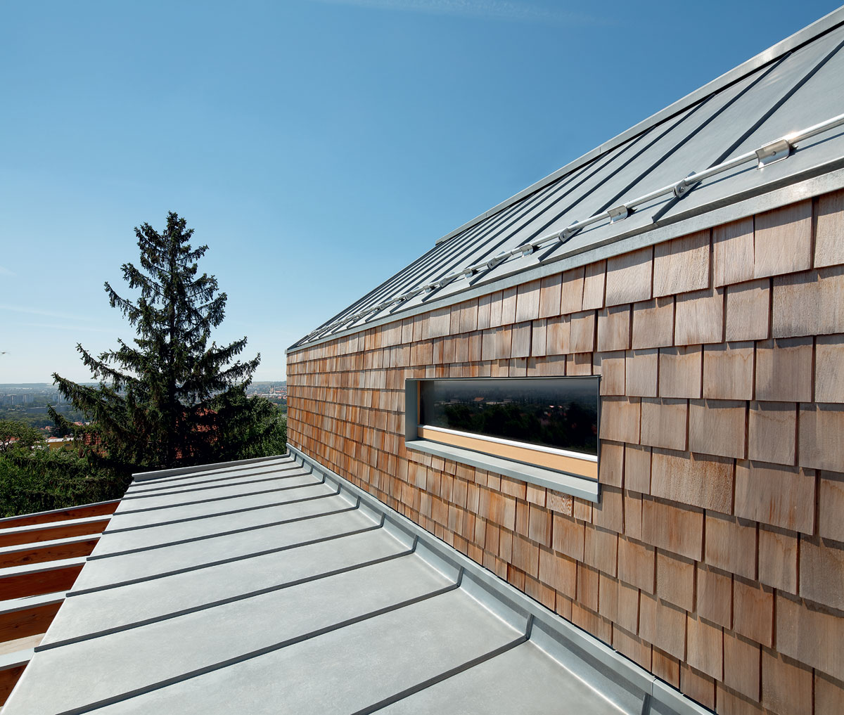 Strecha z tzv. rheinzinku titánzinku tvorí súčasť bezúdržbovej fasády z trvácich materiálov.