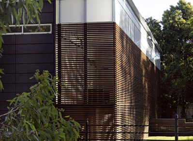Polopriehľadný latkový kubus verandy je včlenený do bloku domu. Pri príchode z ulice sa verandou vstupuje priamo na vrchné poschodie, na ktorom sú všetky obytné miestnosti. Jednotlivé fasády domu sú odlišné a zároveň v mnohom podobné – napríklad motívom úzkych podstropných okien, ktoré sa opakujú na troch stranách budovy. Obracajú sa aj na vstupnú verandu a osvetľujú schodisko. |
