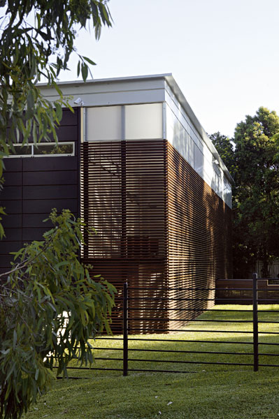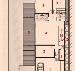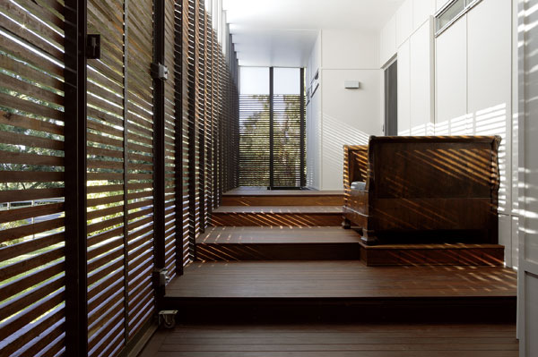 | Vstupovanie do domu i vychádzanie z pracovne do záhrady je rituálom štyroch krokov po schodoch. Opakuje sa aj na verande otočenej do ulice, cez ktorú sa vchádza do domu – kráča sa v tieni ľahkej latkovej fasády okolo starožitnej pohovky k vstupným dverám vedúcim priamo do obývacieho priestoru. |
