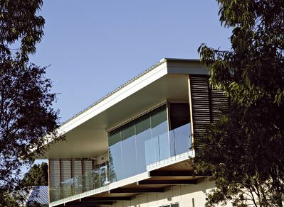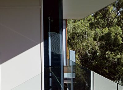 Tri terasy zeleninovej záhrady na konci parcely oddeľuje od vody – pravda, iba v čase odlivu – mangrovový lesík. Obojživelné kríky a stromy so zvláštnymi dýchacími koreňmi obklopujú takmer celú kosu polostrova, na ktorom veľa miesta na pláže neostalo. K moru sa terén zvažuje pomerne prudko – z tejto strany pribudlo domu podlažie a dojem je až monumentálny. Prirodzene, kde inde by mohol vrcholiť motív priehľadnosti než tu, na záhradnej fasáde. Veľkými plochami je obrátená k nepretržitému divadlu hladiny, oblohy a horizontu so severnými pobrežnými štvrťami Brisbane a najväčším austrálskym jachtovým prístavom. Preto na terasách horného podlažia prevzali aj funkciu zábradlí dokonale priehľadné plochy zo sklených tabúľ.