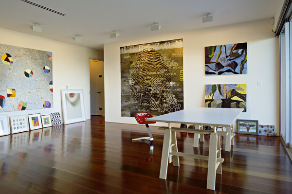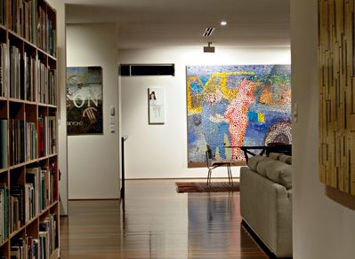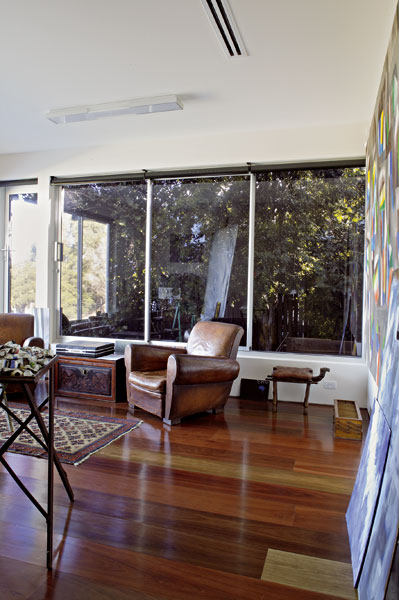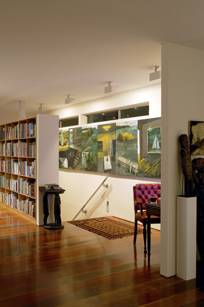 | Štyri diela od troch špičkových austrálskych maliarov – dvoch spojených so Sydney, jedného s Melbourne. V čele knižnice, oddeľujúcej chodbu od schodiska, je na figurálnom stolíku model tohto domu (pohľad od jedálne cez obytný priestor smerom k spálňam). | Vo veľkej pracovni na spodnom podlaží je legendárna stolička od Achilleho Castiglioniho. Ani sa nechce veriť, že ju vytvoril presne pred 50 rokmi. |