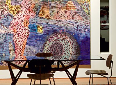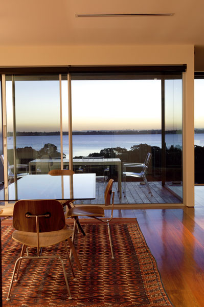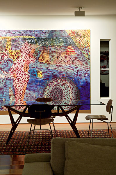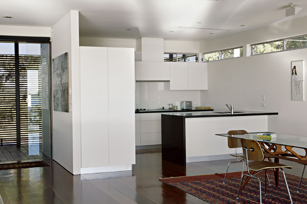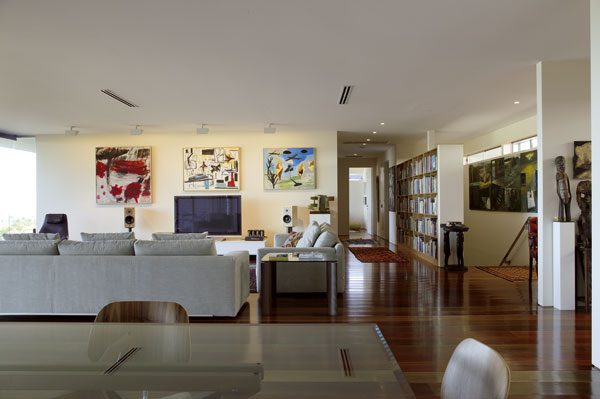 Sklenená kazeta ukazuje, kde je srdce domu. Do obytnej časti sa otvára jedálenský, kuchynský a študijný priestor. Celý dom je plný umeleckých diel, no v tejto priestrannej spoločenskej časti sú tie najvzácnejšie. Visia tu obrazy austrálskych klasikov, ktorí by dozaista dostali čestné miesto v národnej galérii v Canberre, a medzi nimi stoja legendy z dejín dizajnu, najmä jedálenský stôl Reale Table od Carla Molina z moreného orechového dreva (Zanotta, 1946), ktorému robia spoločnosť viac-menej súčasné stoličky od Charlesa Eamesa zladené obdobím vzniku aj materiálom – orechovou dyhou, ktorá je v tomto prípade skombinovaná s lešteným hliníkom.