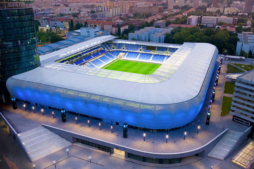 Základným princípom pri definovaní rozmerov a tvaru objektov boli správna orientácia zo severu na juh, záväzné rozmery hracej plochy, požadovaná kapacita 22 500 divákov, profil tribún a ich celoplošné zastrešenie. Tým vznikol koncept plató, na ktorom je osadený samotný objekt štadióna, kde sa nachádzajú všetky hlavné vstupy. Plató je prístupné cez široké schodiská. Dominantným prvkom areálu je prekrytie hľadiska štadióna ľahkou oceľovou konštrukciou s plastovou membránou, ktorá je nasvecovaná farebnou ilumináciou.