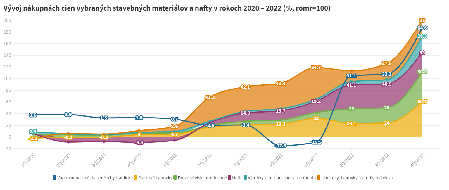 V uplynulých dvoch rokoch museli developeri bojovať s infláciou pri stavebných materiáloch. Ceny stúpali pri oceli, betóne či dreve. Ak mal generálny dodávateľ stavby (stavebná spoločnosť) s developerom projektu nastavenú štandardnú pevnú cenu za dodanie diela a ceny stavebných materiálov extrémne narástli, problém mal primárne generálny dodávateľ stavby.