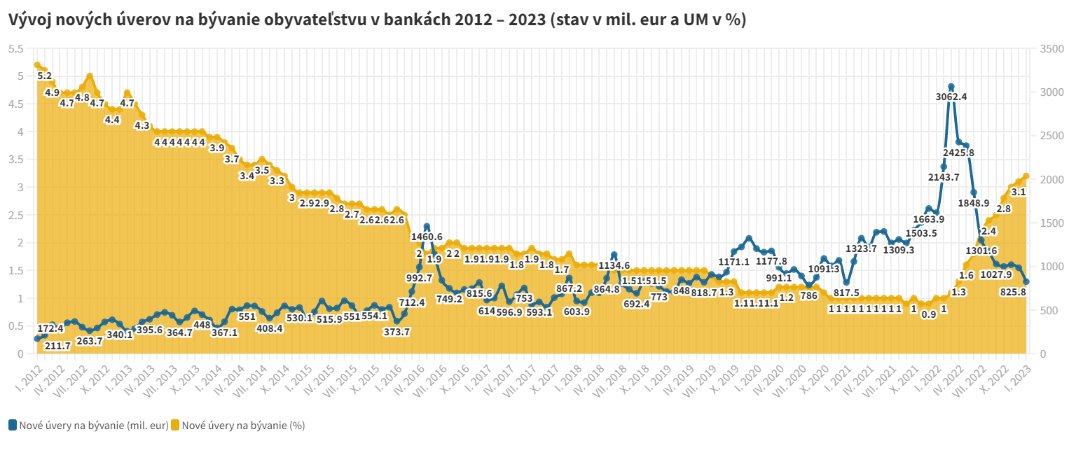 Vývoj nových úverov na bývanie obyvateľstvu v bankách 2012 – 2023 (stav v mil. eur a UM v %).