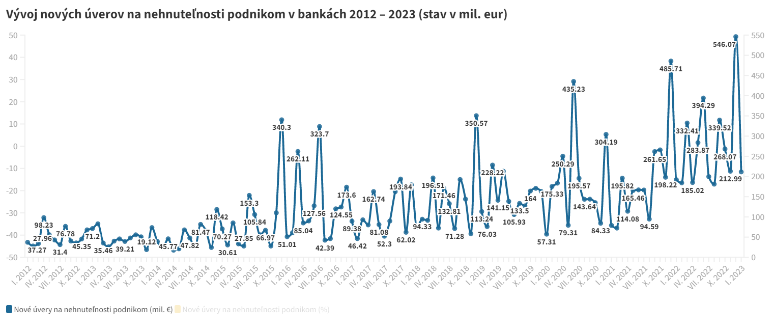 Vývoj nových úverov na nehnuteľnosti podnikom v bankách 2012 – 2023 (stav v mil. eur)