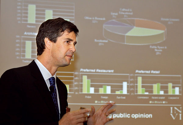 V úvodnej prednáške Guy Perry zo spoločnosti In-Vi predstavil plánovanie veľkých multifunkčných zón ako development 21. storočia. Podľa jeho slov sa musia mestá vyvíjať ústretovejšie k ľuďom a ich potrebám. „Väčšina obyvateľov sa do Bratislavy prisťahovala z dedín a malých miest v slovenských regiónoch. Keď potom bývajú na sídlisku v Petržalke, nemožno sa čudovať, že sa tam necítia príliš dobre,“ vysvetľuje. Predstavil aj svoje dieťa – projekt Centrop, ktorý má vytvoriť príjemné prostredie na život práve pre nových obyvateľov Bratislavy.