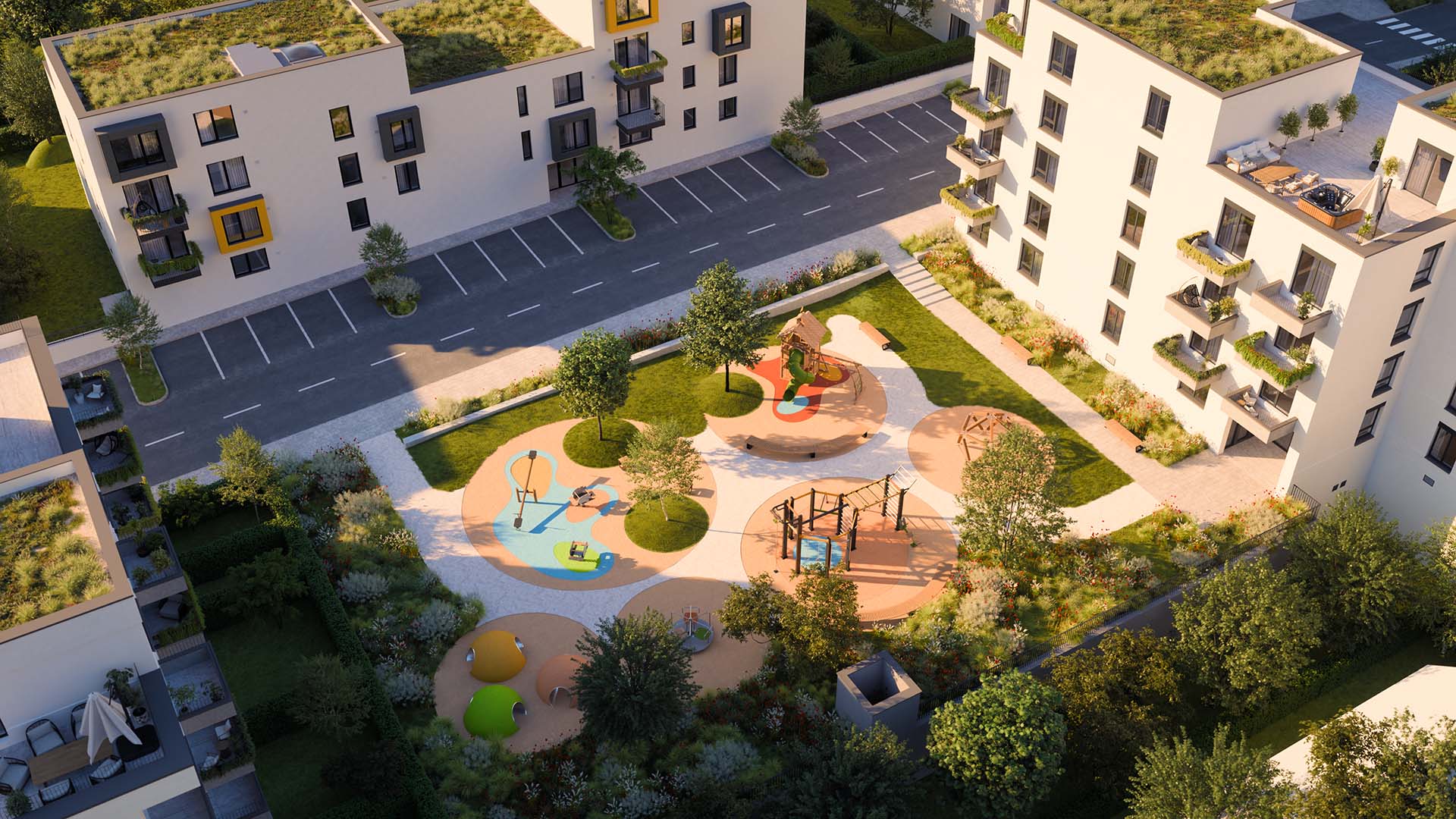 Jediným uceleným spoločným priestorom je spevnená plocha s detským a športovým ihriskom.