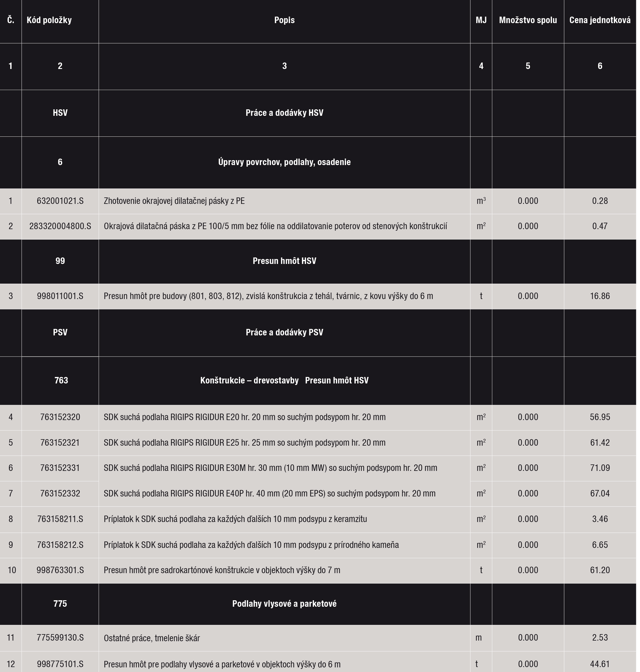 Súpis cenníkových položiek potrebných na ocenenie montáže suchej podlahy