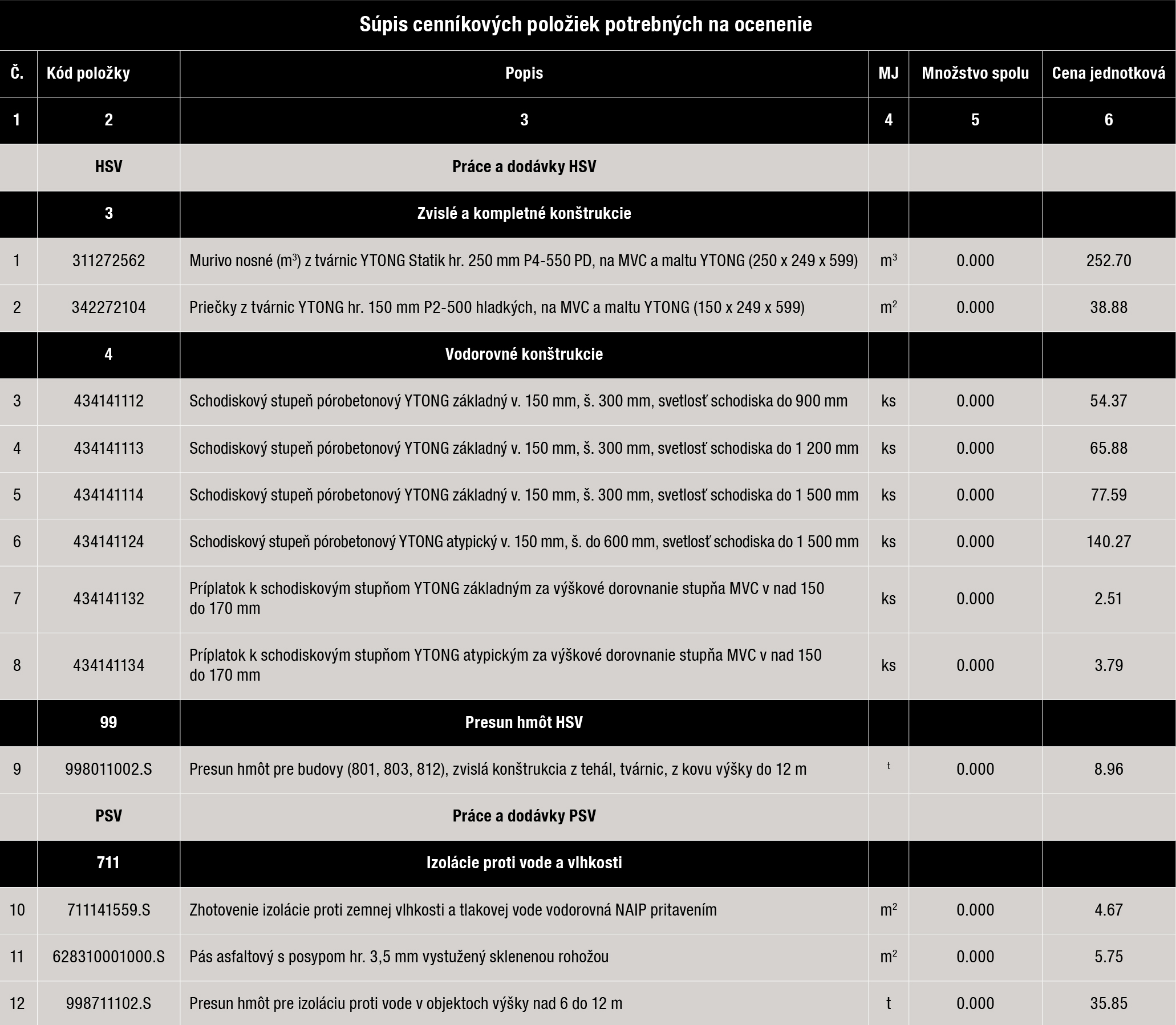 Súpis cenníkových položiek potrebných na ocenenie schodiska z pórobetónu