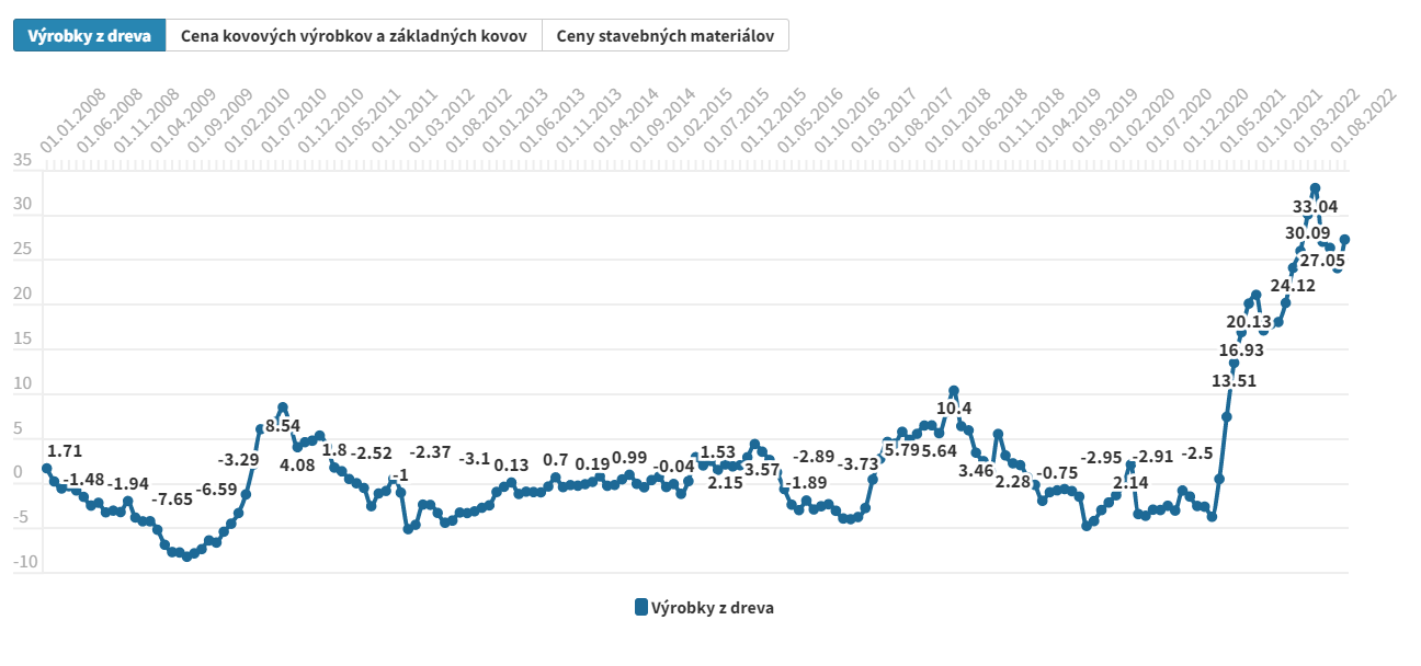 Pri drevených materiáloch ostal na hladine 20% rast cien pri najviac skoňovaných preglejkách, drevotrieskových doskách a parketových paneloch. Pri oceľových a železných materiáloch najviac stúpala cena pri takisto už spomínaných výstužových tyčiach a sieťovine o 42%.
