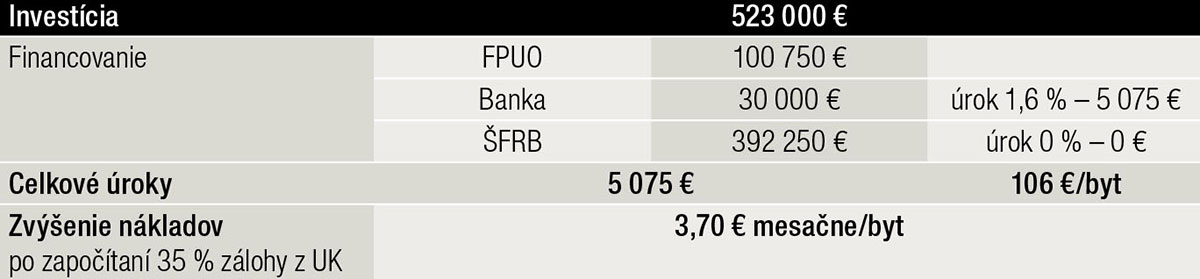 Tab. 3 Financovanie investície z FPUO úveru z banky a úveru ŠFRB tri účely oprávnených nákladov