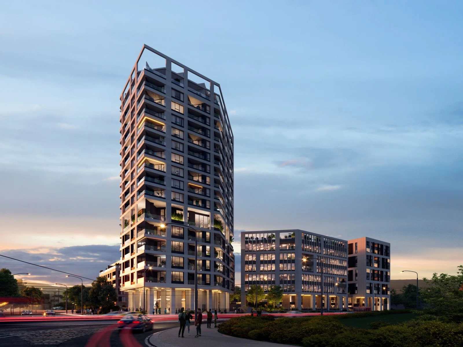 PARQ Zátišie s dominantým vežovým objektom na nároží ulíc Vajnorská-Zátišie