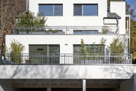 Nové exteriérové schodisko s výťahom je umiestnené na východnej fasáde tak, aby vchody do bytov boli v strede dispozície. Prístup k novému komunikačnému priestoru je zo spodnej časti pozemku bezbariérovou vyhrievanou rampou.