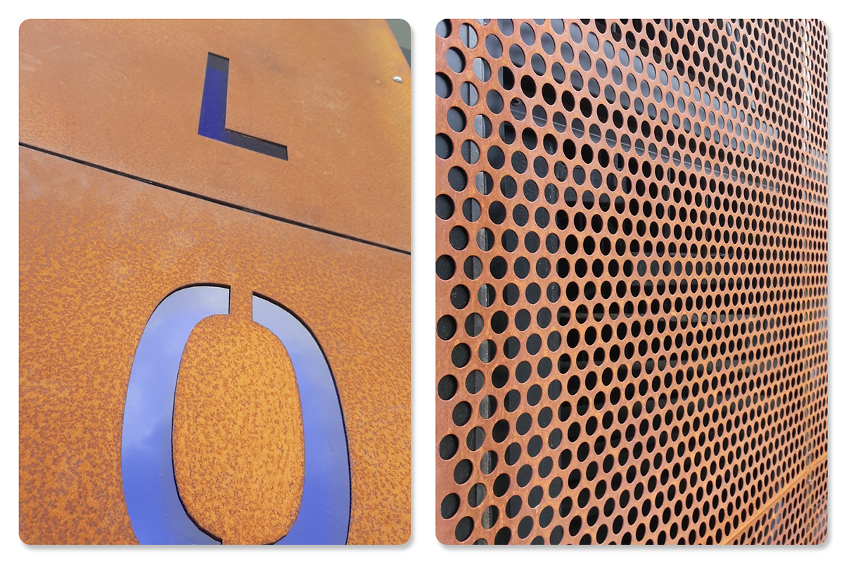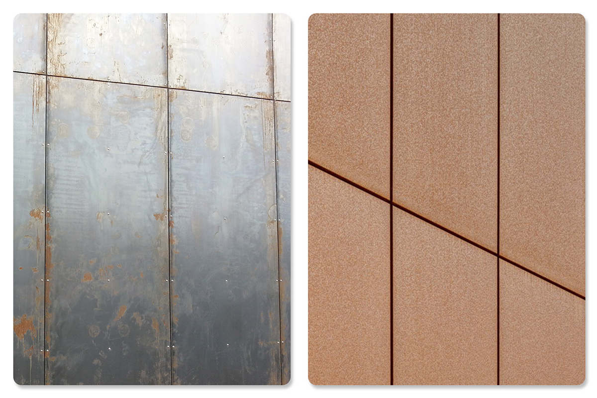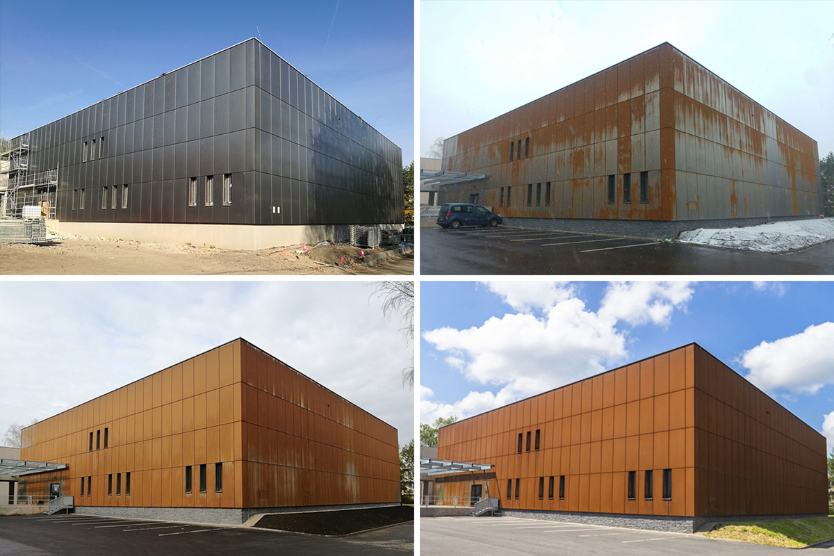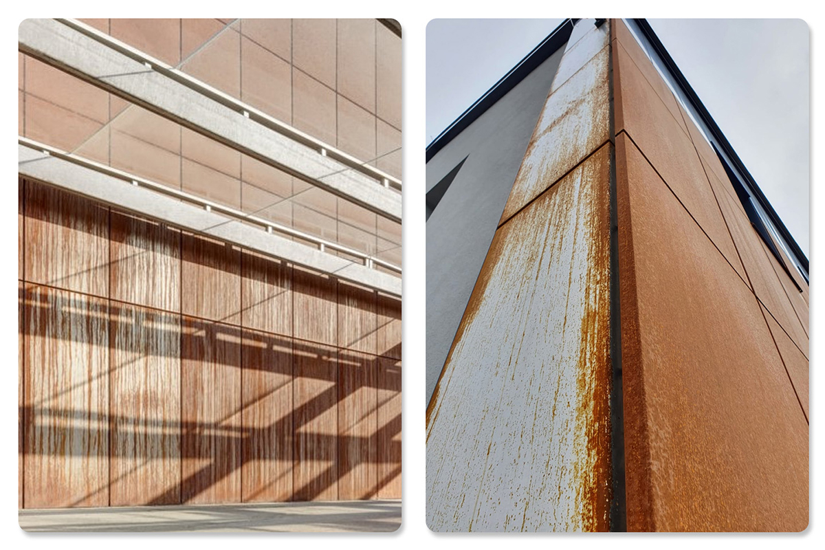 Corten na rôznych častiach objektu môže vykazovať rôznu farebnosť a dobu patinácie. Náveterné strany budú zrieť inak ako záveterné, časti cortenovej fasády pod prístreškami môžu zrieť aj niekoľko rokov.