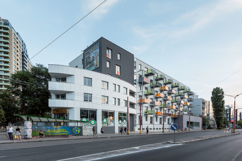 Pôvodný železobetónový skelet vykazoval dostatočnú únosnosť, preto ho bolo možné vyplniť tehlovým murivom so zateplením a nadstavať o jedno podlažie. Na základové pilóty sa uchytil nový funkčný a vizuálny prvok – predsadená oceľová konštrukcia, na ktorú sa osadili farebné balkóny. Tie prepožičiavajú fasáde nielen funkčný, ale aj výtvarný rozmer.
